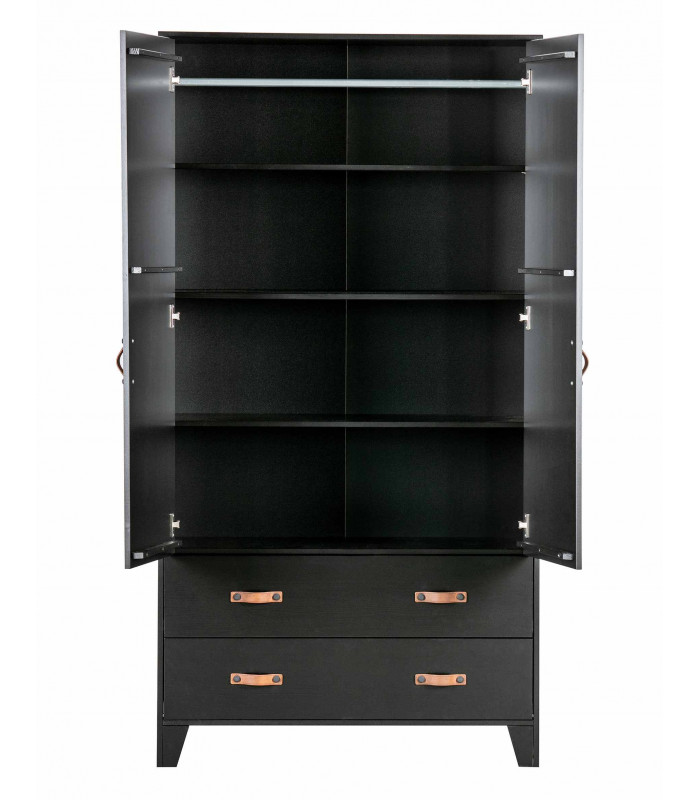 L'armoire est fabriquée en pin, avec une finition noire. L'armoire comporte deux tiroirs avec deux poignées en cuir par tiroir et deux portes avec une poignée en cuir.
