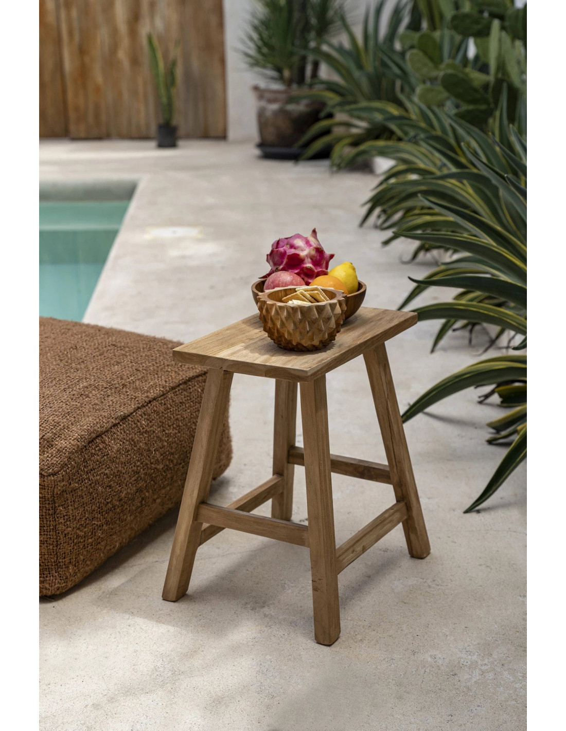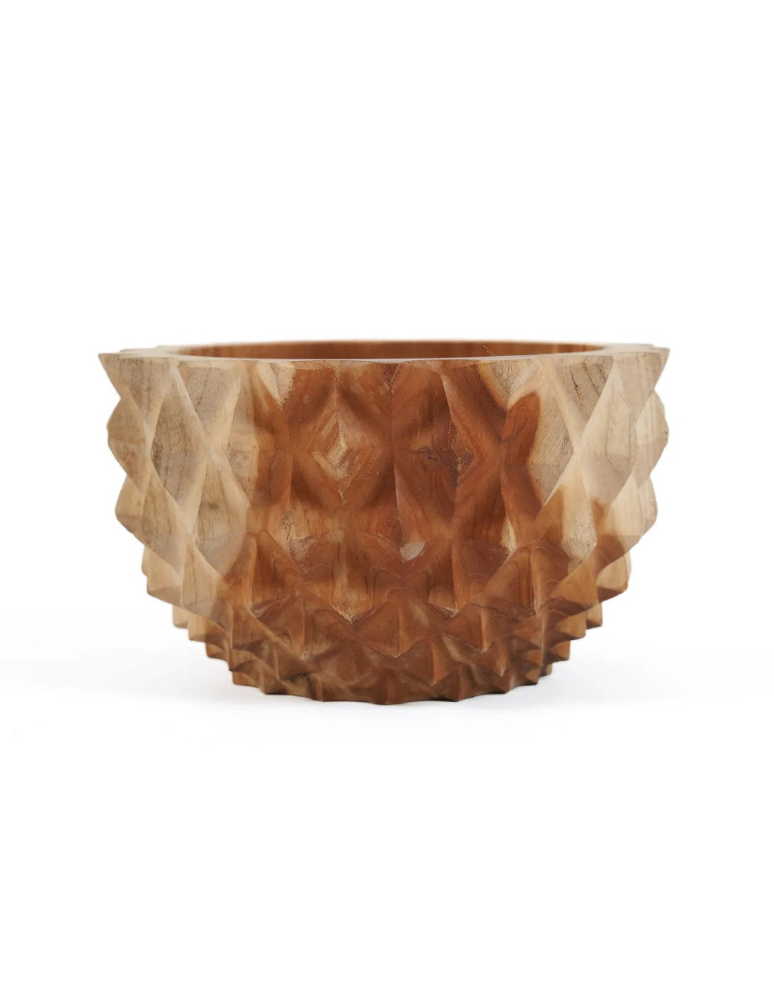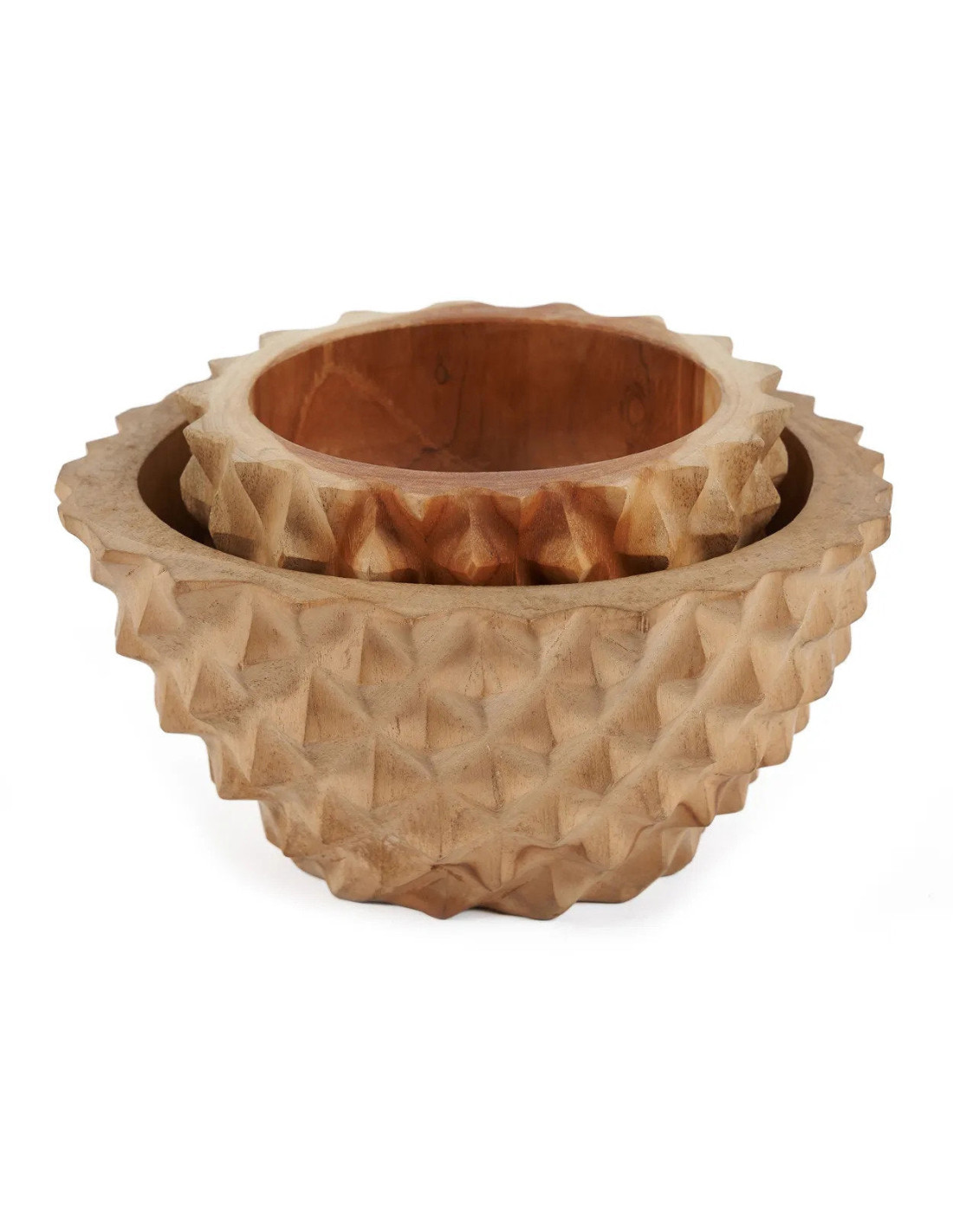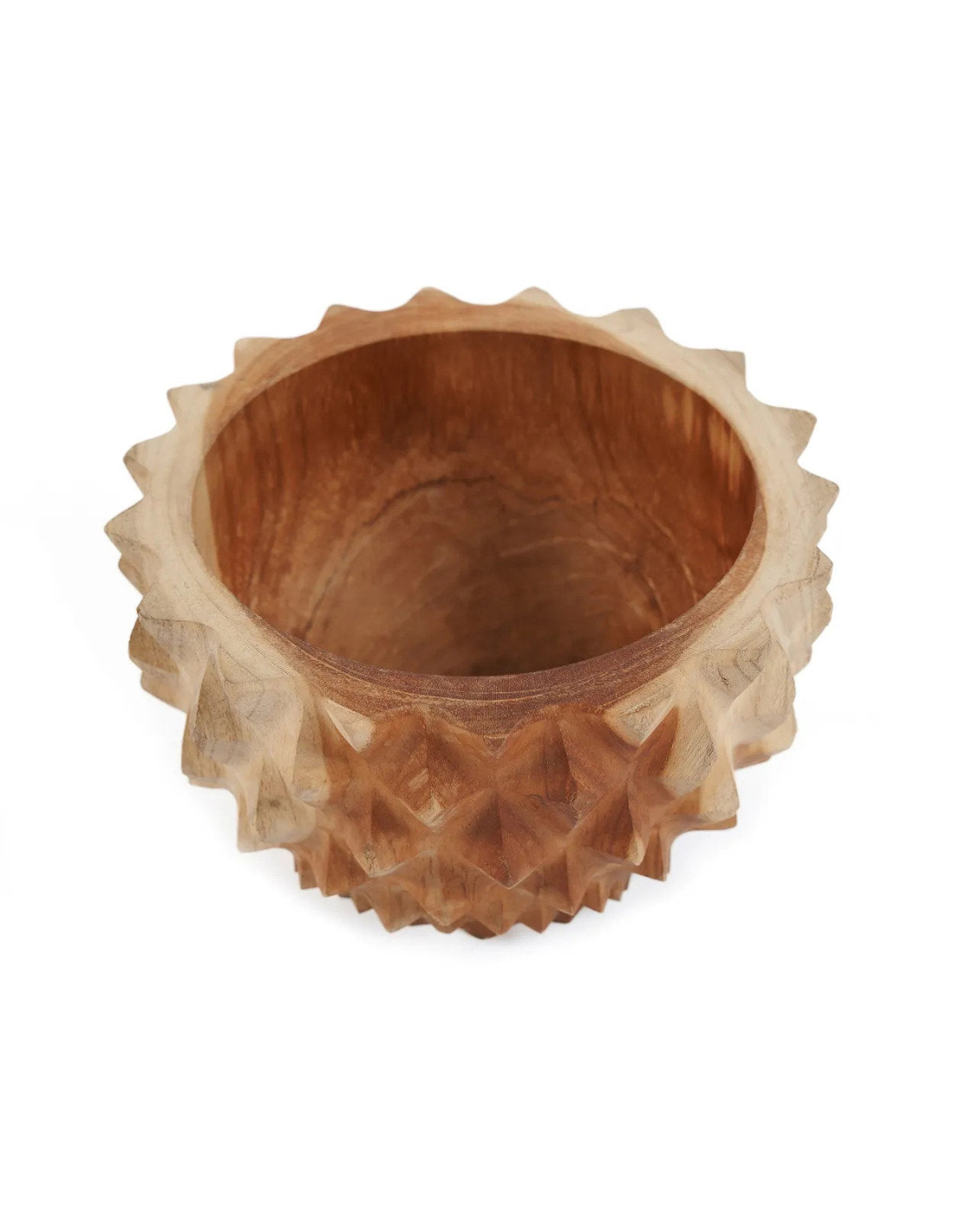 Le design de ce bol s’inspire du fruit durian, souvent appelé le roi des fruits. L’extérieur présente une texture semblable à la coque épineuse du durian. Utilisez-le comme pièce décorative centrale ou comme plat de service pour fruits, noix ou collations. Les tons profonds et riches du bois de teck mettent en valeur sa durabilité et son intemporalité, en faisant un ajout durable à toute maison ou collection.