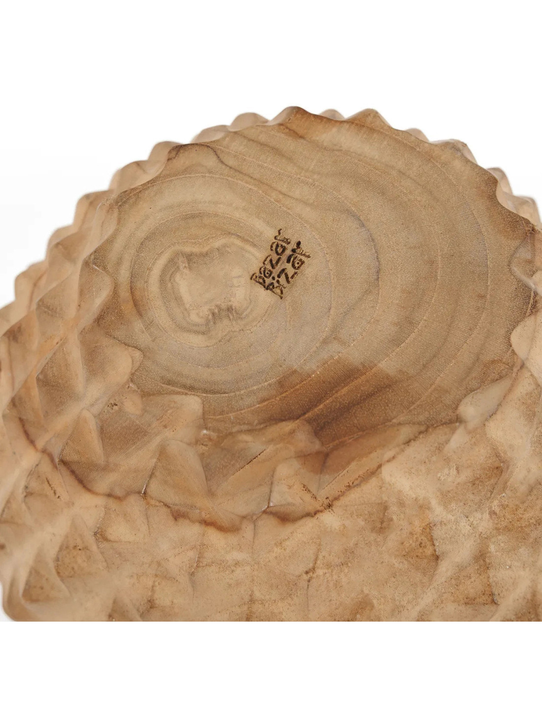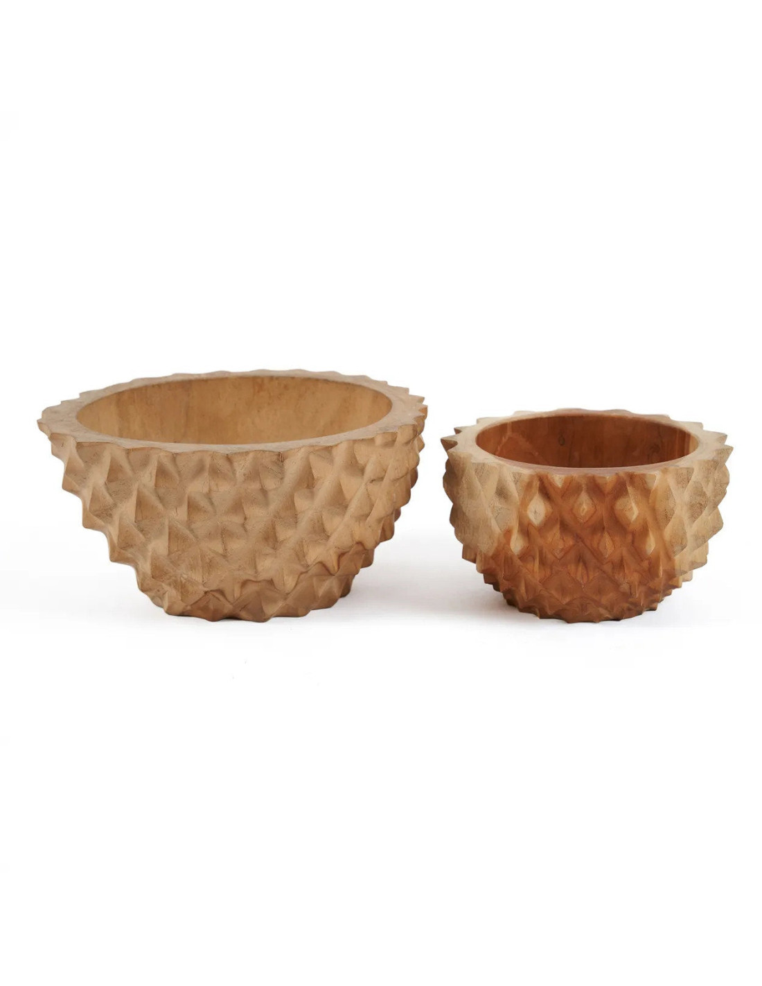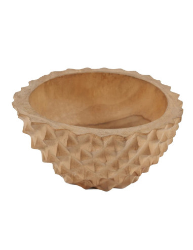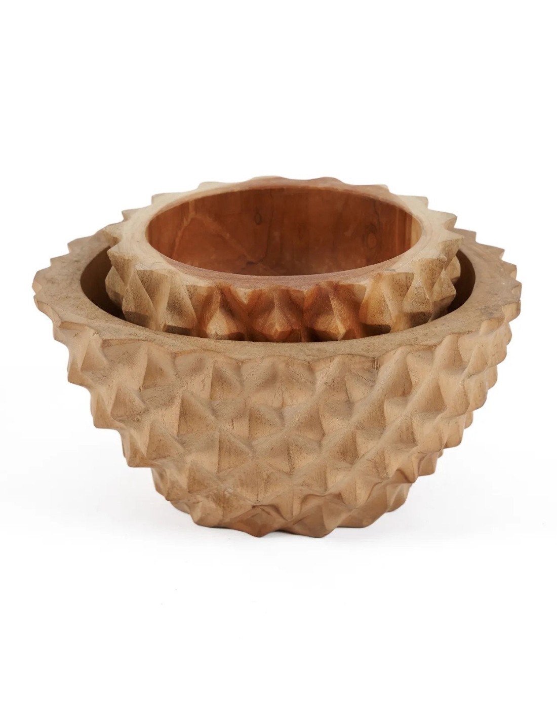 Le design de ce bol s’inspire du fruit durian, souvent appelé le « roi des fruits ». L’extérieur présente une texture semblable à la coque épineuse du durian. Utilisez-le comme pièce décorative centrale ou comme plat de service pour fruits, noix ou encas. Les tons riches du teck soulignent sa durabilité et son intemporalité, en faisant un ajout précieux à toute maison ou collection.