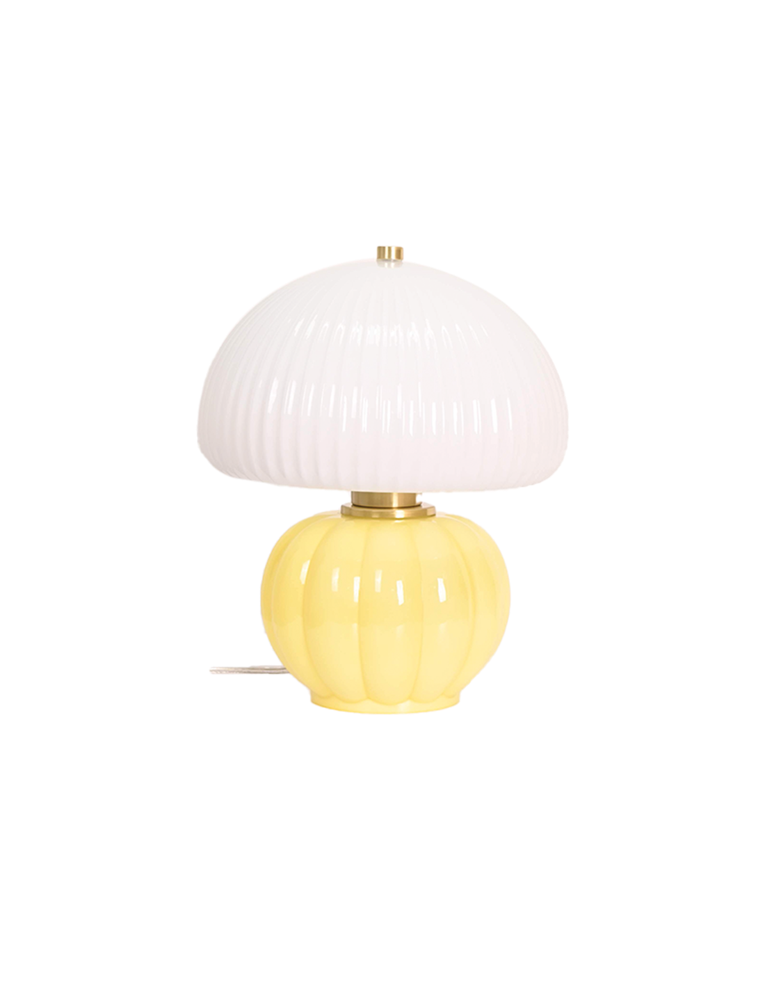 Lampe de bureau décorative avec base en verre brillant beige et abat jour en verre mate strié blanc.