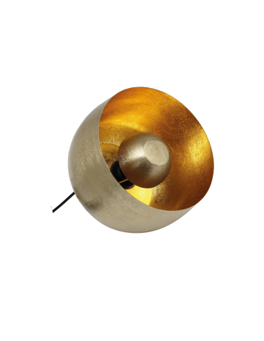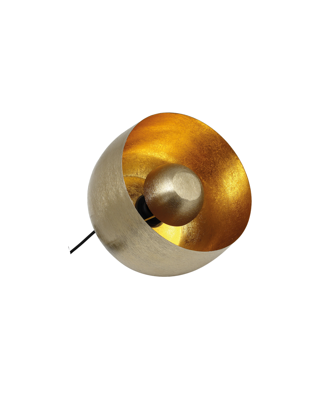 Lumière douce et présence brute. Cette lampe en métal se pose partout, au sol comme sur un meuble. Son large anneau assure une parfaite stabilité, tandis que son intérieur doré réfléchit une lumière douce et indirecte. Sous la cloche, un petit capuchon protège l’ampoule pour une ambiance tamisée, sans éblouir.