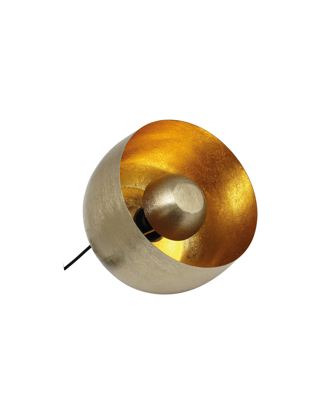 Lumière douce et présence brute. Cette lampe en métal se pose partout, au sol comme sur un meuble. Son large anneau assure une parfaite stabilité, tandis que son intérieur doré réfléchit une lumière douce et indirecte. Sous la cloche, un petit capuchon protège l’ampoule pour une ambiance tamisée, sans éblouir.