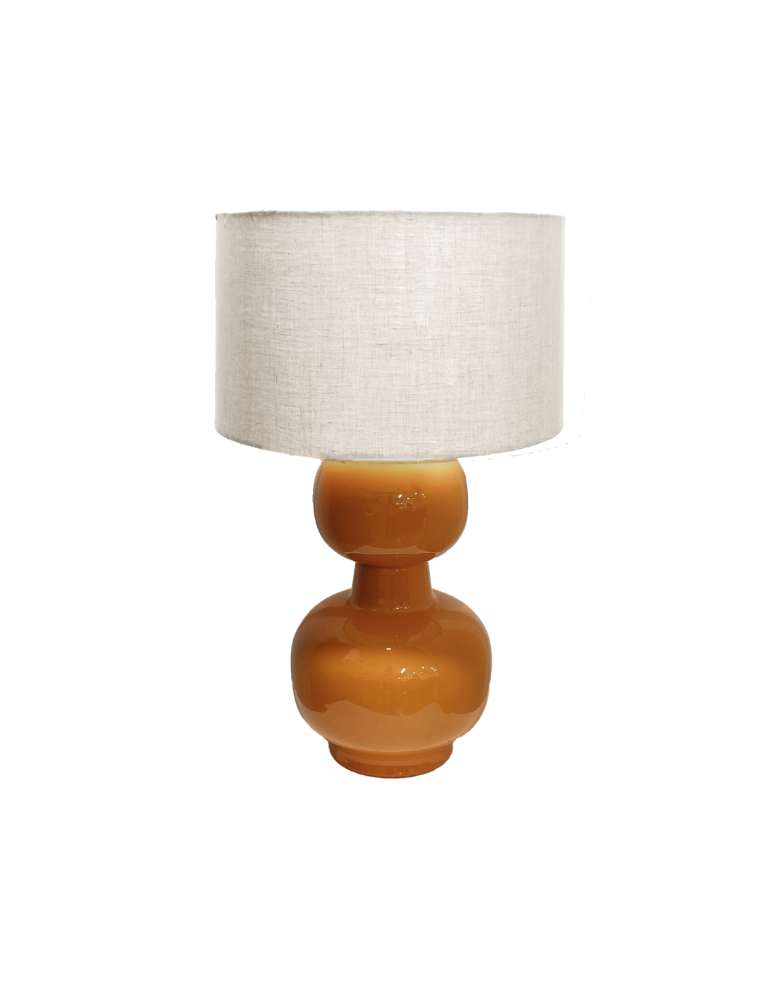 Lampe de bureau avec base en métal laquée beige et abat jour en toile de coton couleur lin.