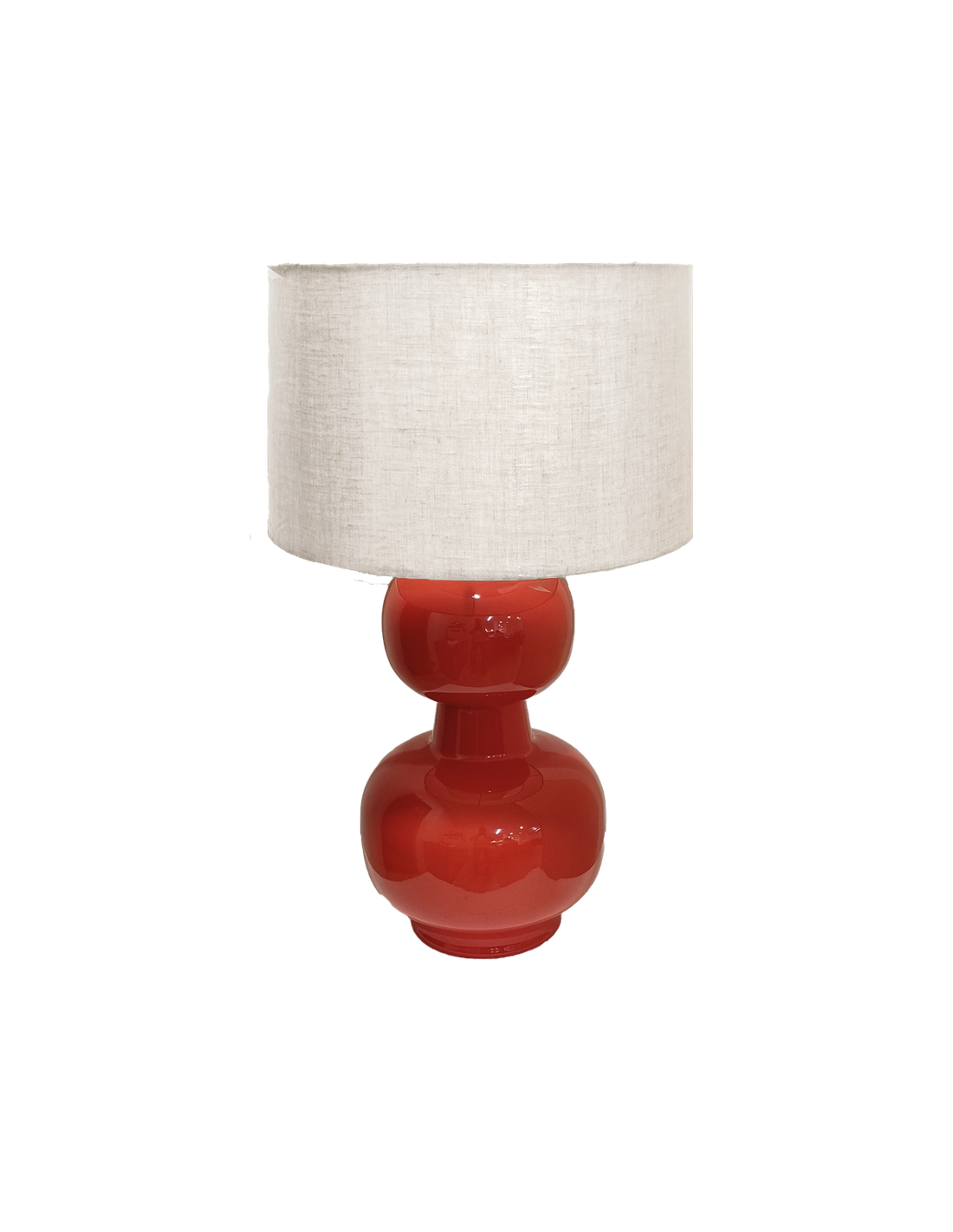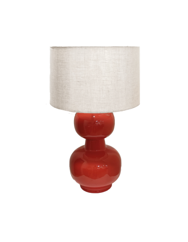 Lampe de bureau avec base en métal laquée beige et abat jour en toile de coton couleur lin.