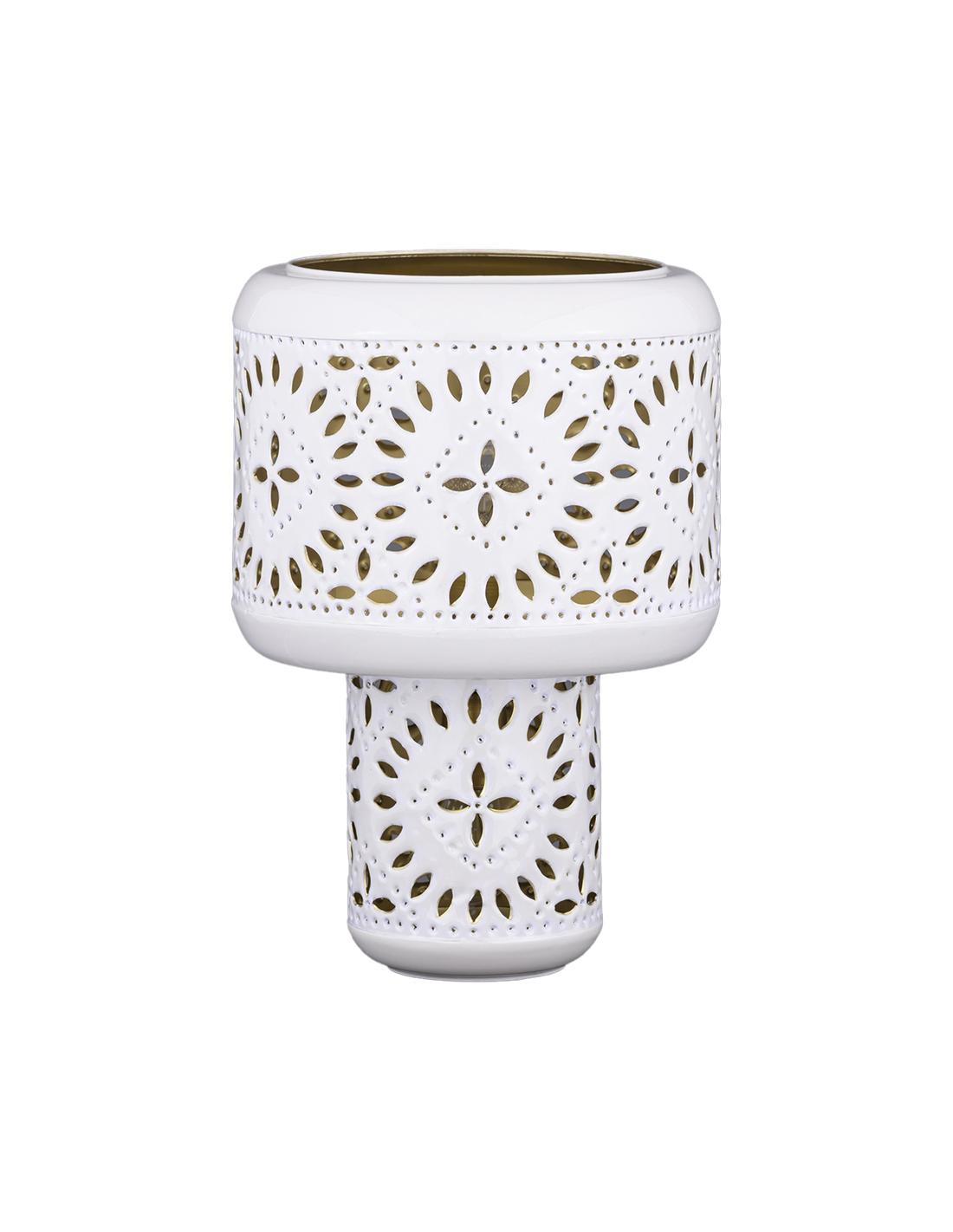 OpjetInspirée des lanternes marocaines, cette lampe en métal émaillé ajouré diffuse une lumière chaleureuse grâce à son double éclairage, dans le pied et l’abat-jour.