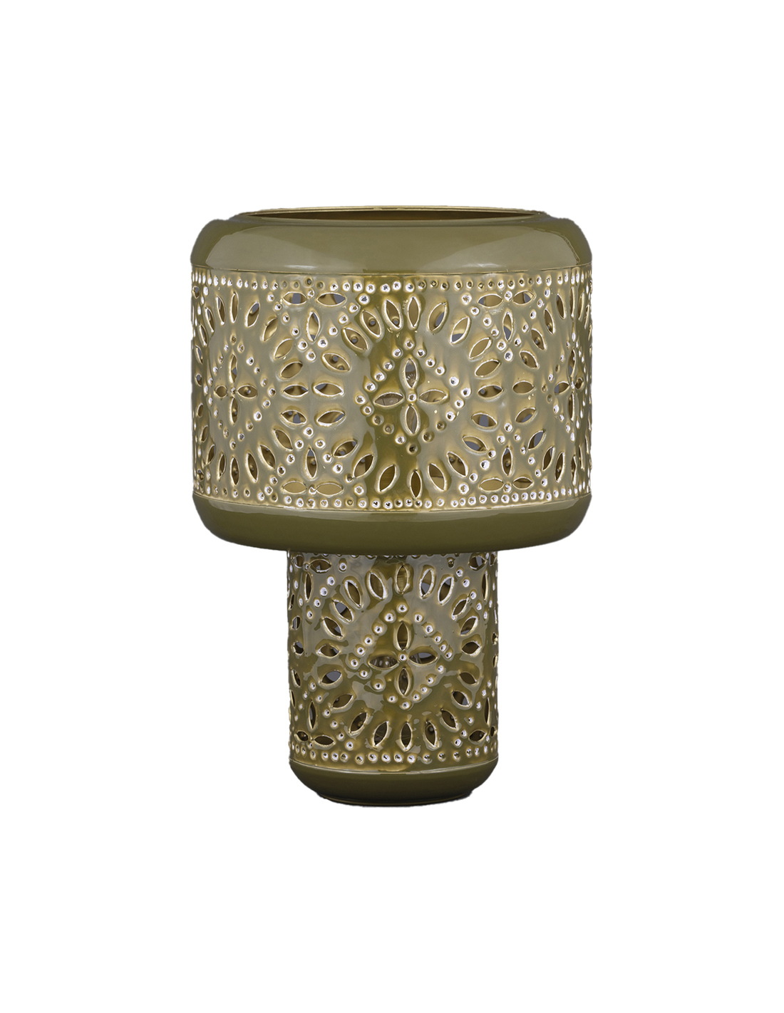 OpjetInspirée des lanternes marocaines, cette lampe en métal émaillé ajouré diffuse une lumière chaleureuse grâce à son double éclairage, dans le pied et l’abat-jour.