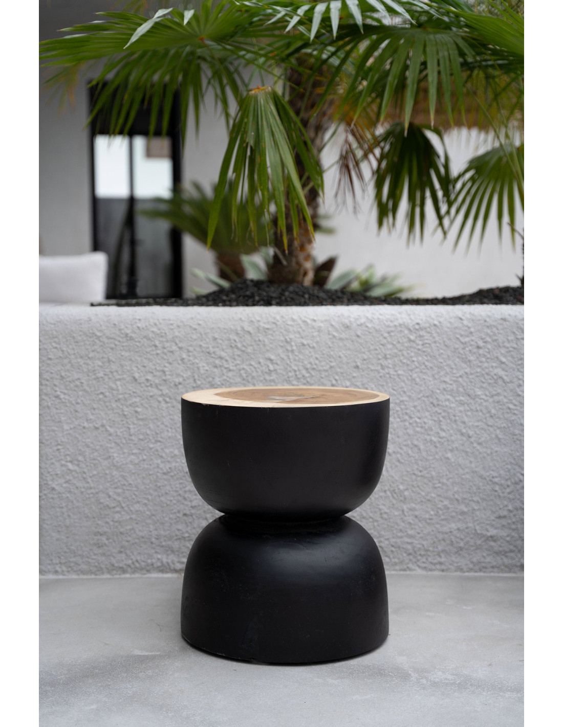 Le Karbun (charbon de bois) évoque la beauté sombre et brillante d'un meuble noir. Le bois de suar revêtu de noir est transformé à la main en un design lisse, rond et organique, parfait comme tabouret, table d'appoint ou table de chevet dans n'importe quelle pièce.