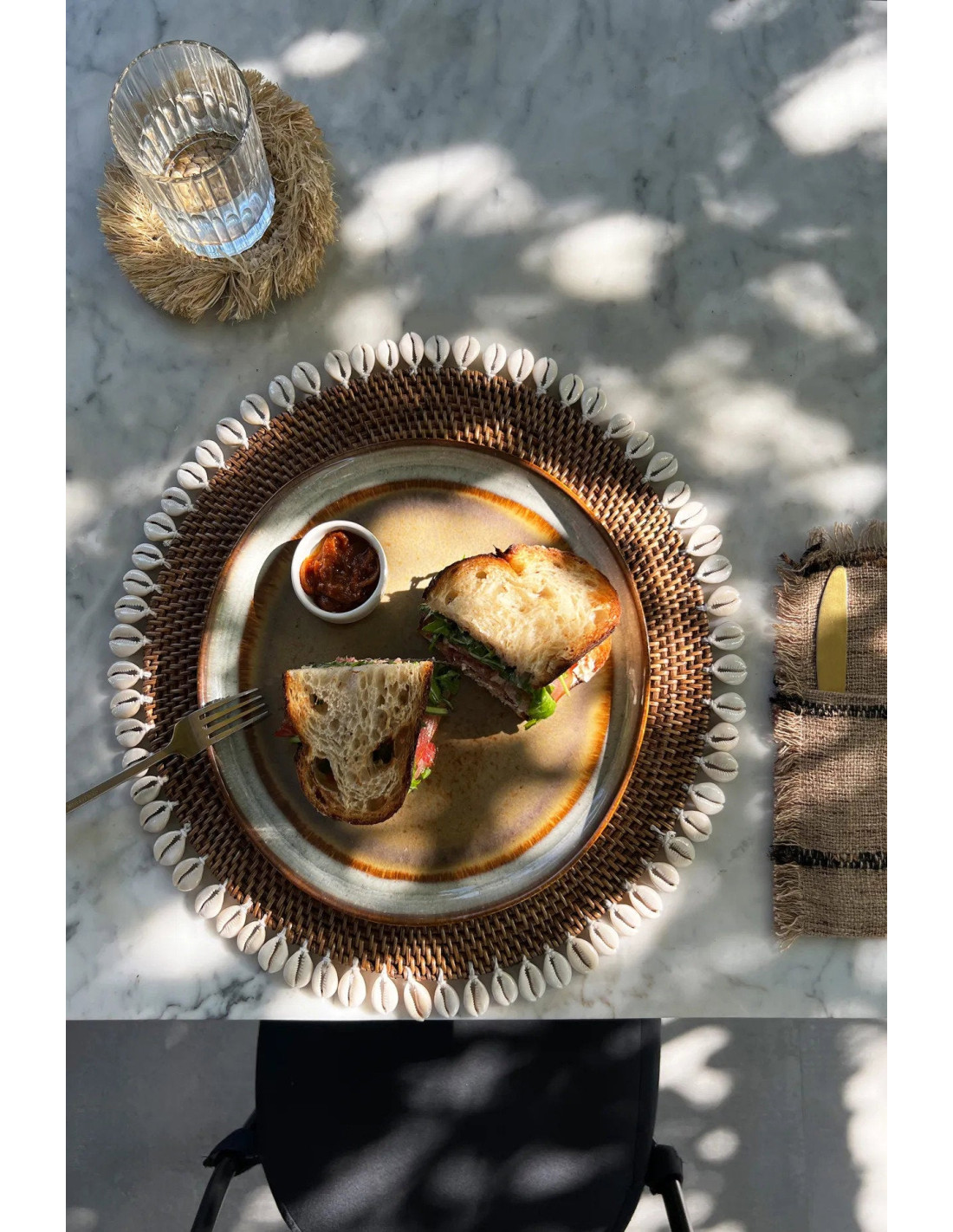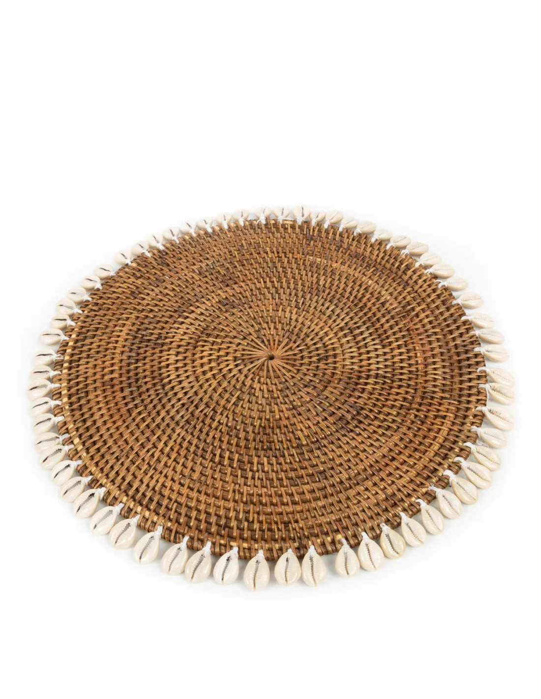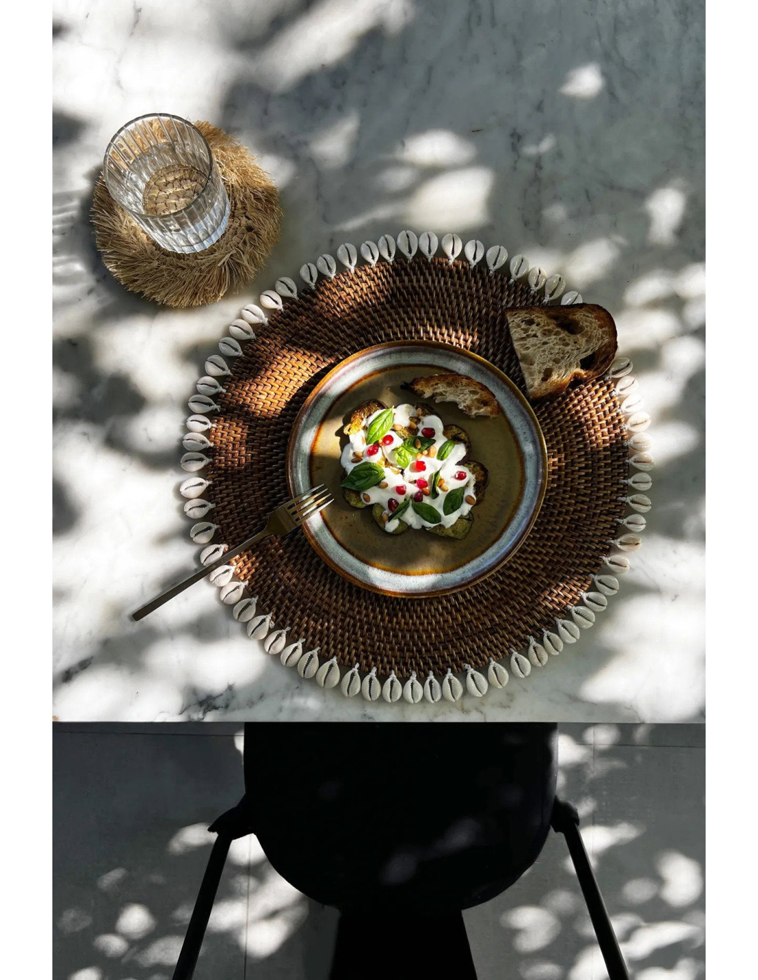 Bazar BizarApportez le style îlien chez vous avec ce magnifique set de table en rotin tressé à la main entouré de coquillages cauris, ajoutant une touche tropicale à votre table.