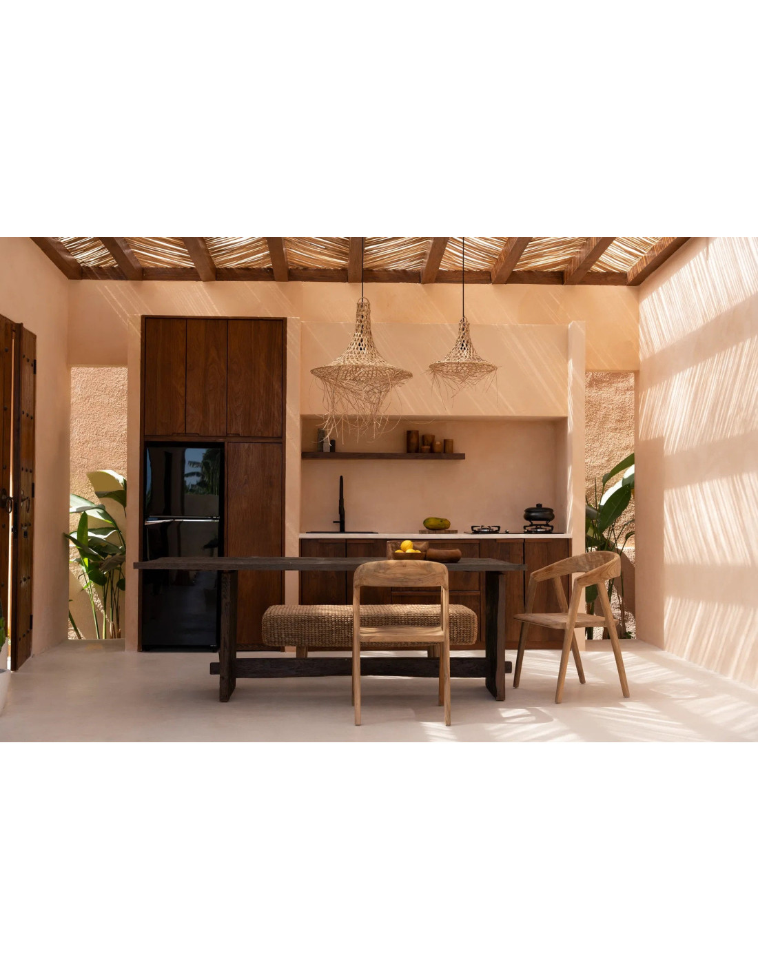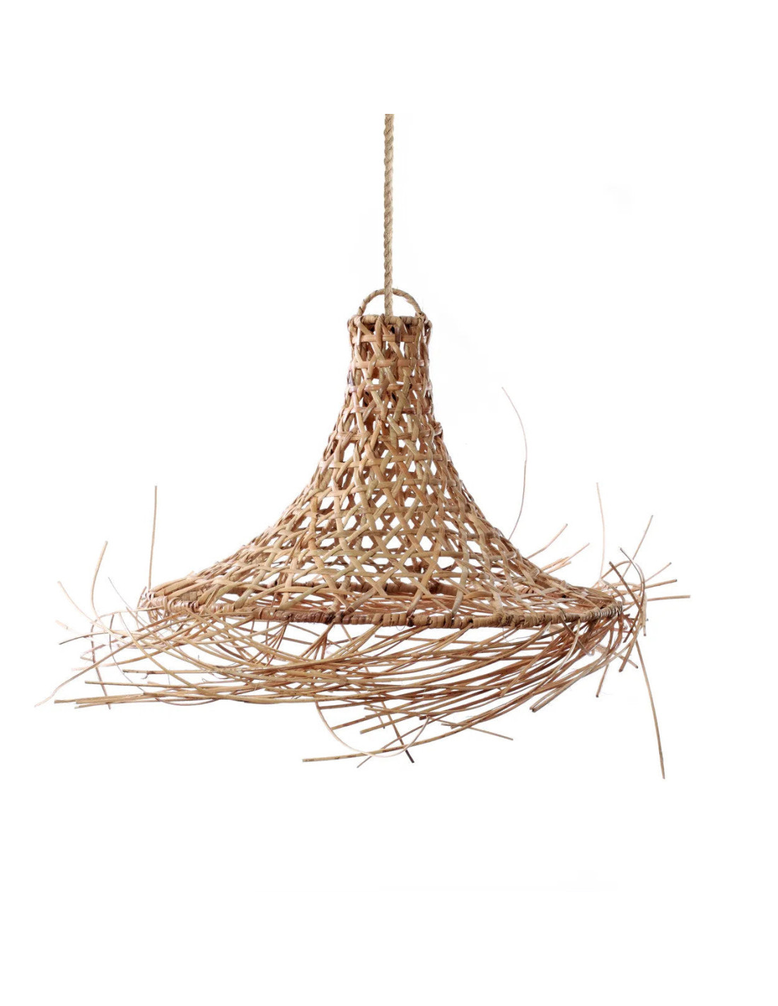 Une suspension artisanale en rotin, créant une ambiance bohème dans divers espaces intérieurs.