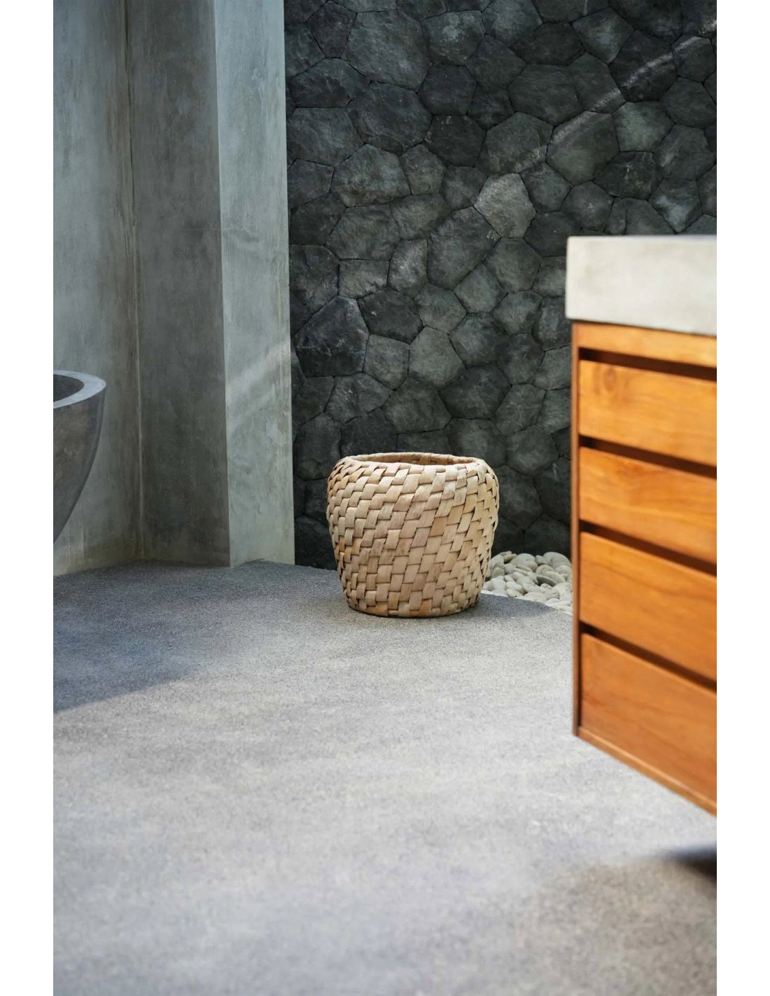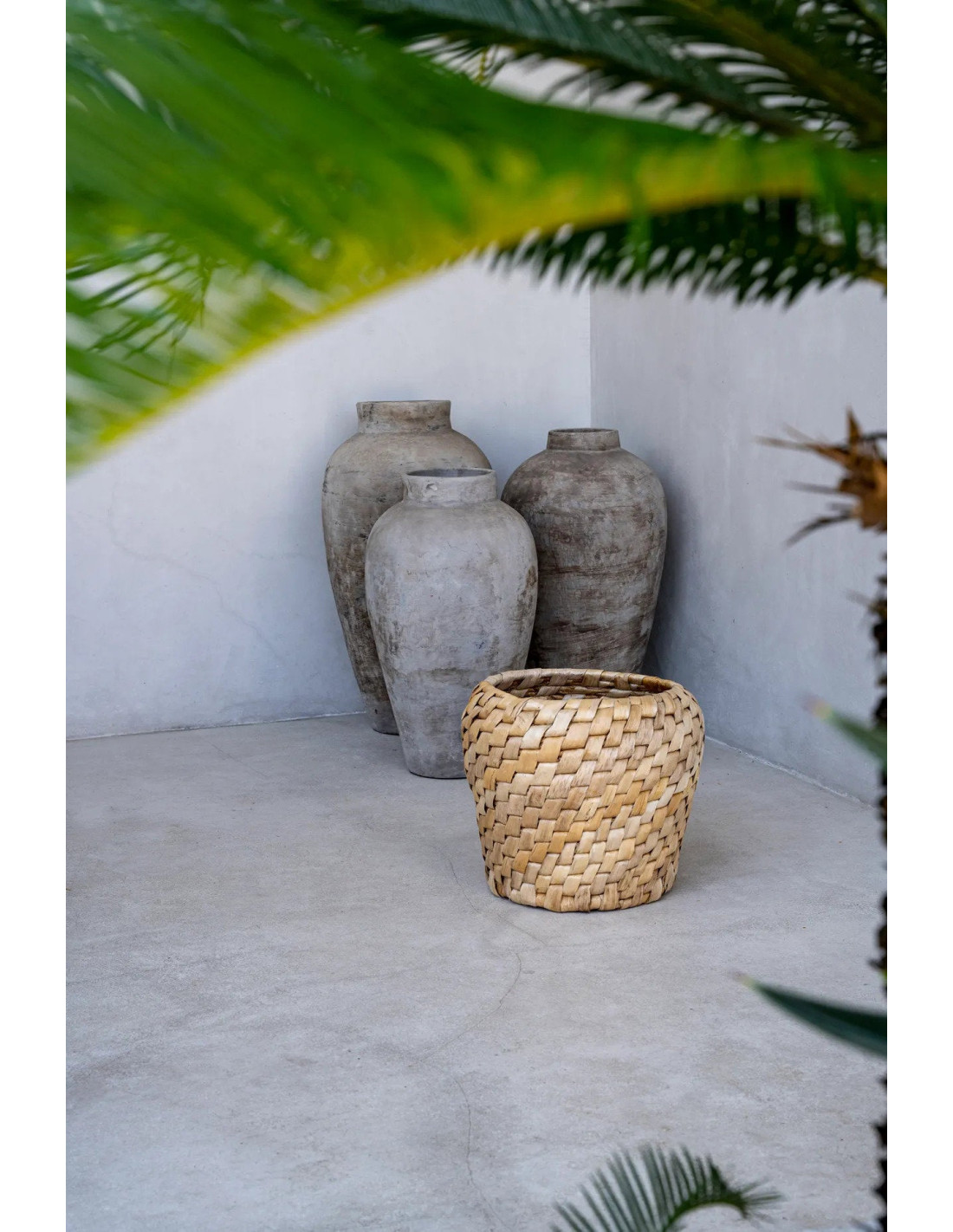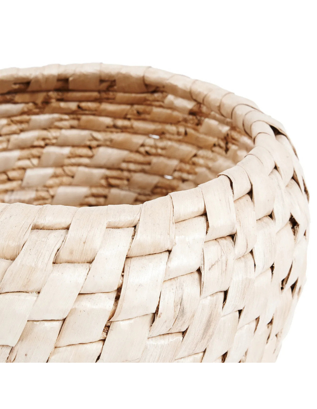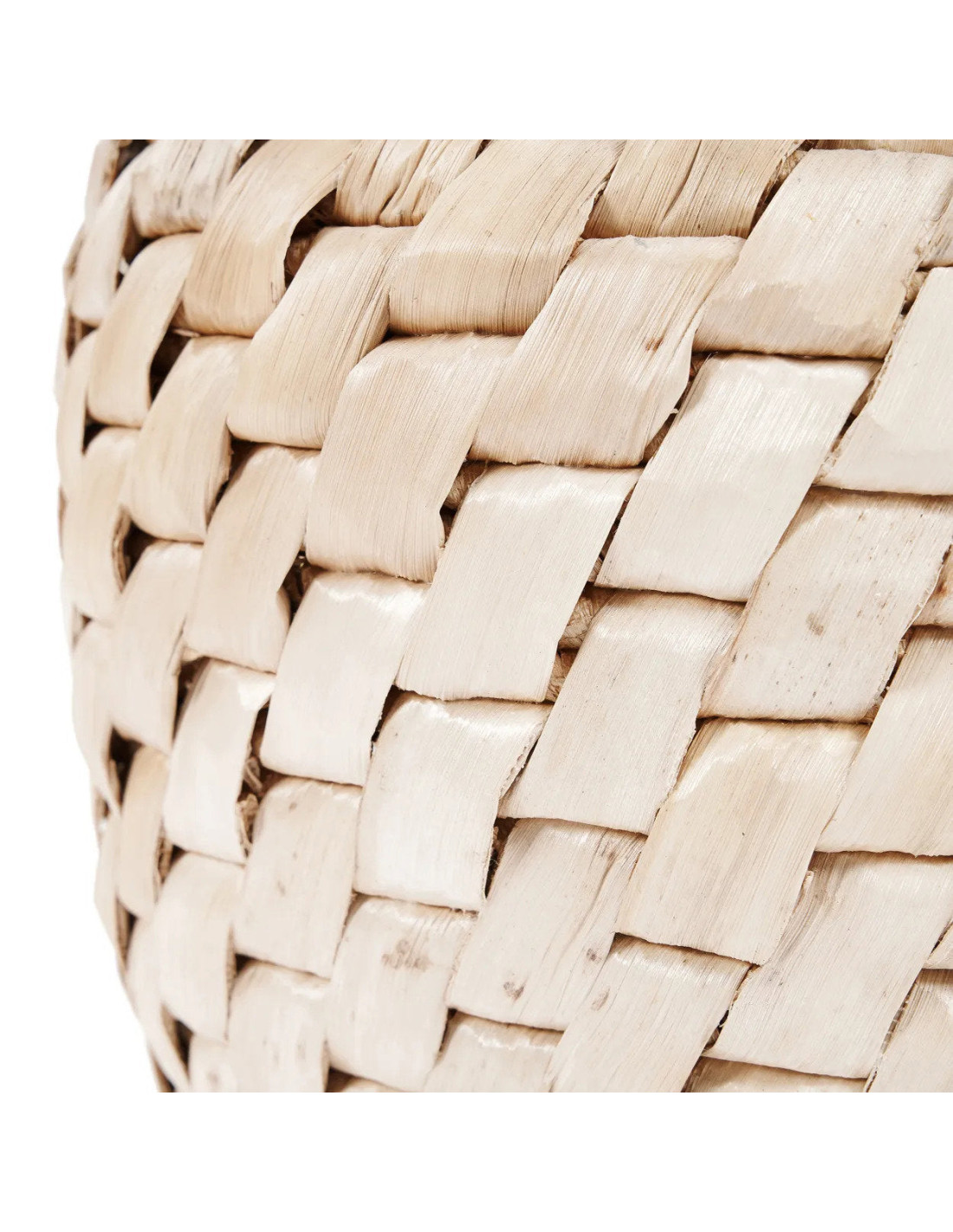 Ce panier original en feuille de bananier de couleur claire présente un motif diagonal enchanteur qui ajoute du style à n'importe quelle pièce. La silhouette ronde offre un rangement polyvalent et un plaisir visuel. Le mélange artistique de matériaux durables et de design raffiné fait du panier Chidi une pièce maîtresse qui améliore à la fois la fonctionnalité et l'esthétique de votre espace. Dimensions : 34 cm (H) x 41 cm (L) x 41 cm (L) Matériaux : Jacinthe d'eau Couleur : Naturel
