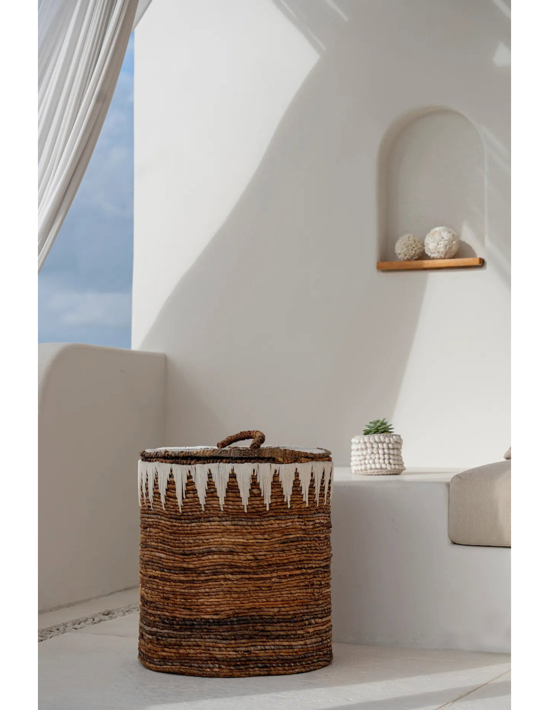Nous adorons ces paniers décoratifs ! Ces paniers magnifiquement tissés à la main en feuilles de bananier avec des détails graphiques blancs en coton sont parfaits pour ranger votre linge, les serviettes ou les jouets dans votre salon ou la chambre d'enfant. Vous pouvez même y mettre une plante exotique pour ajouter une touche côtière à votre intérieur.
