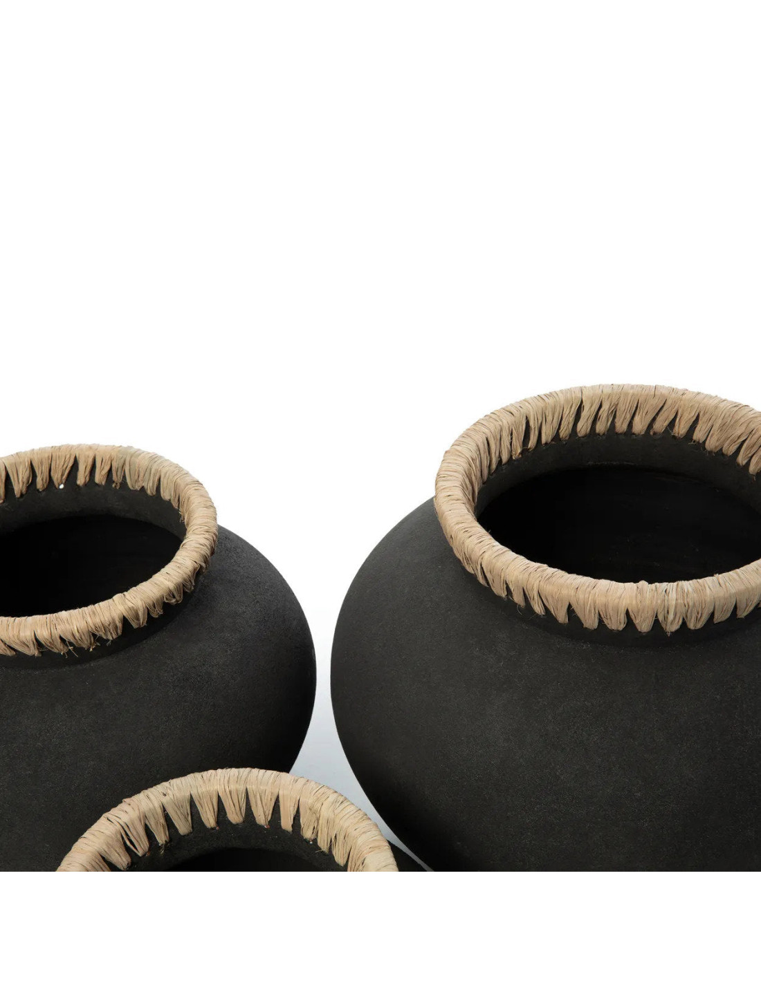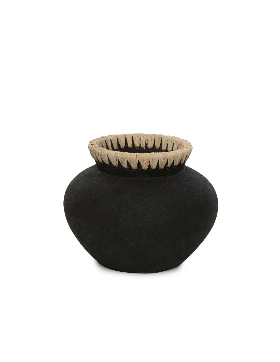 Offrez à vos fleurs séchées le vase qu'elles méritent avec ce chef-d'œuvre en terre cuite, disponible en trois tailles. Le détail en raphia sur le bord apporte une touche instantanée de bord de mer à votre salon, votre salle de bains ou votre espace extérieur couvert. Disponible en 2 couleurs. Attention : ce vase n'est pas étanche et ne doit être utilisé qu'avec des fleurs sèches. Couleur Noir Naturel. Hauteur 19 cm. Largeur 25 cm. Longueur 25 cm. Matériaux : Terre cuite - Raphia.