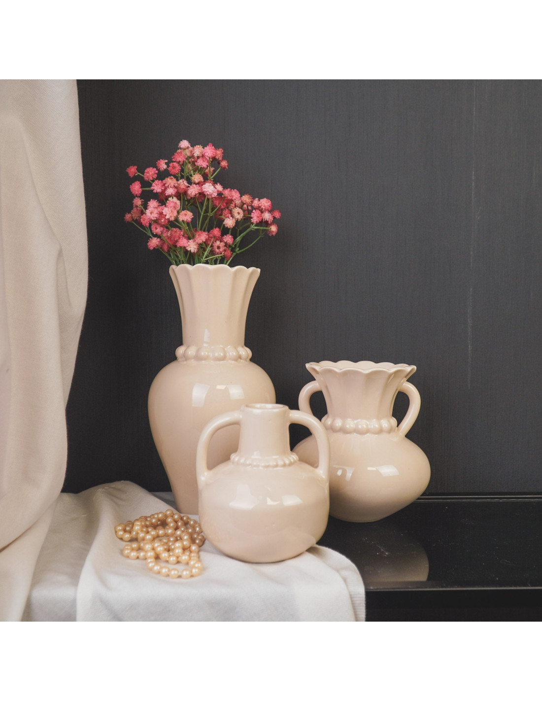 VASE AVEC LE COLLIER DE PERLES - On ne peut jamais avoir assez de vases ! Ce petit vase peut facilement être combiné avec d'autres vases ou bougeoirs. Avec son magnifique collier de perles, ce vase pichet beige a une apparence vraiment unique. Caractéristiques principales : Fabriqué en : Dolomite Dimensions : 14x14x15cm Conseil de style : Le vase pichet couleur sable est également superbe combiné sur un plateau avec d'autres petits vases et bougeoirs, par exemple.