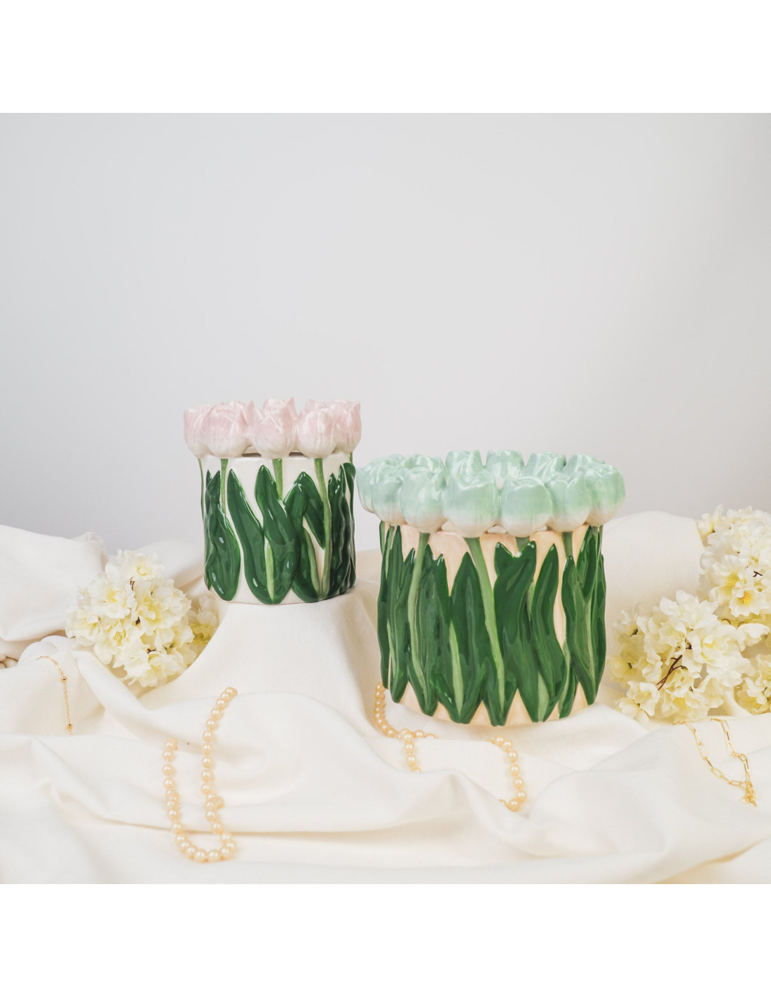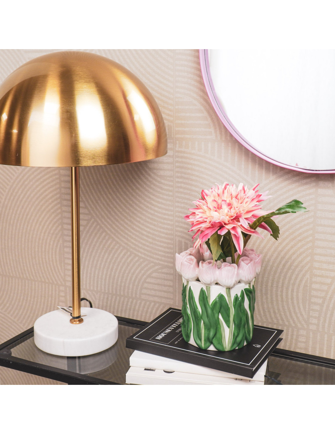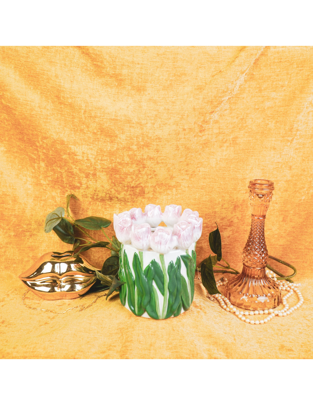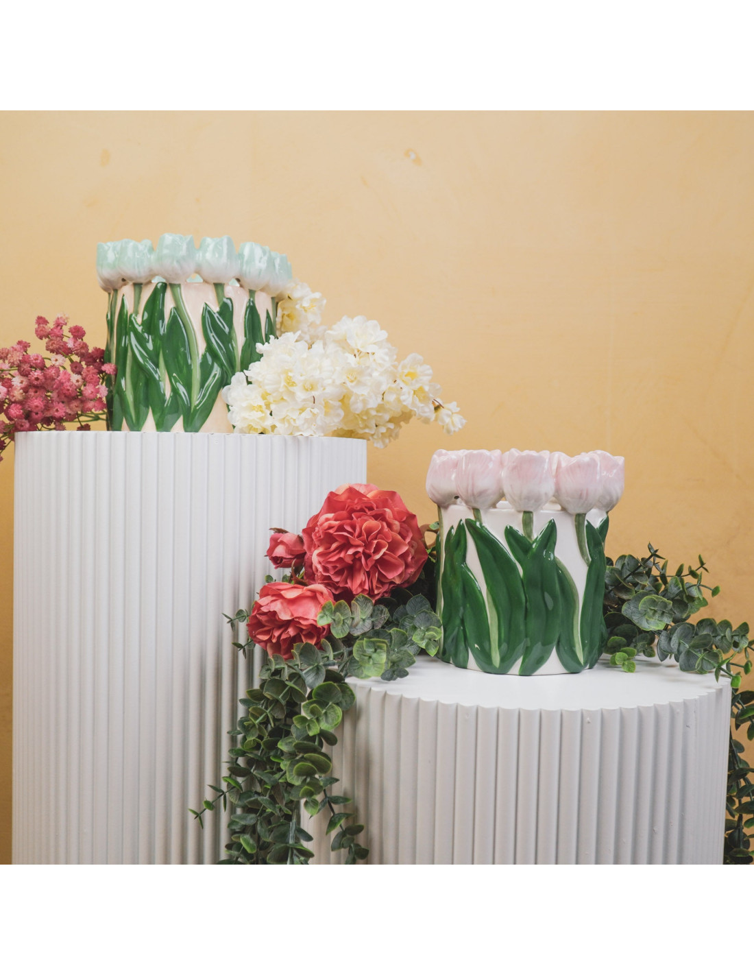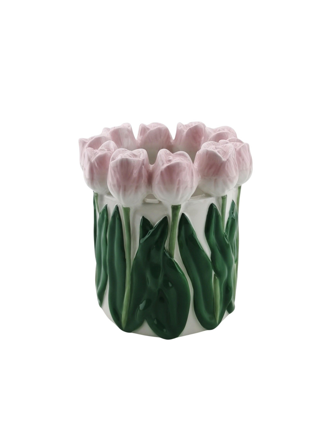 Vase - Tulipes - Dolomite - Rose clair/Vert - 15x15x14cm